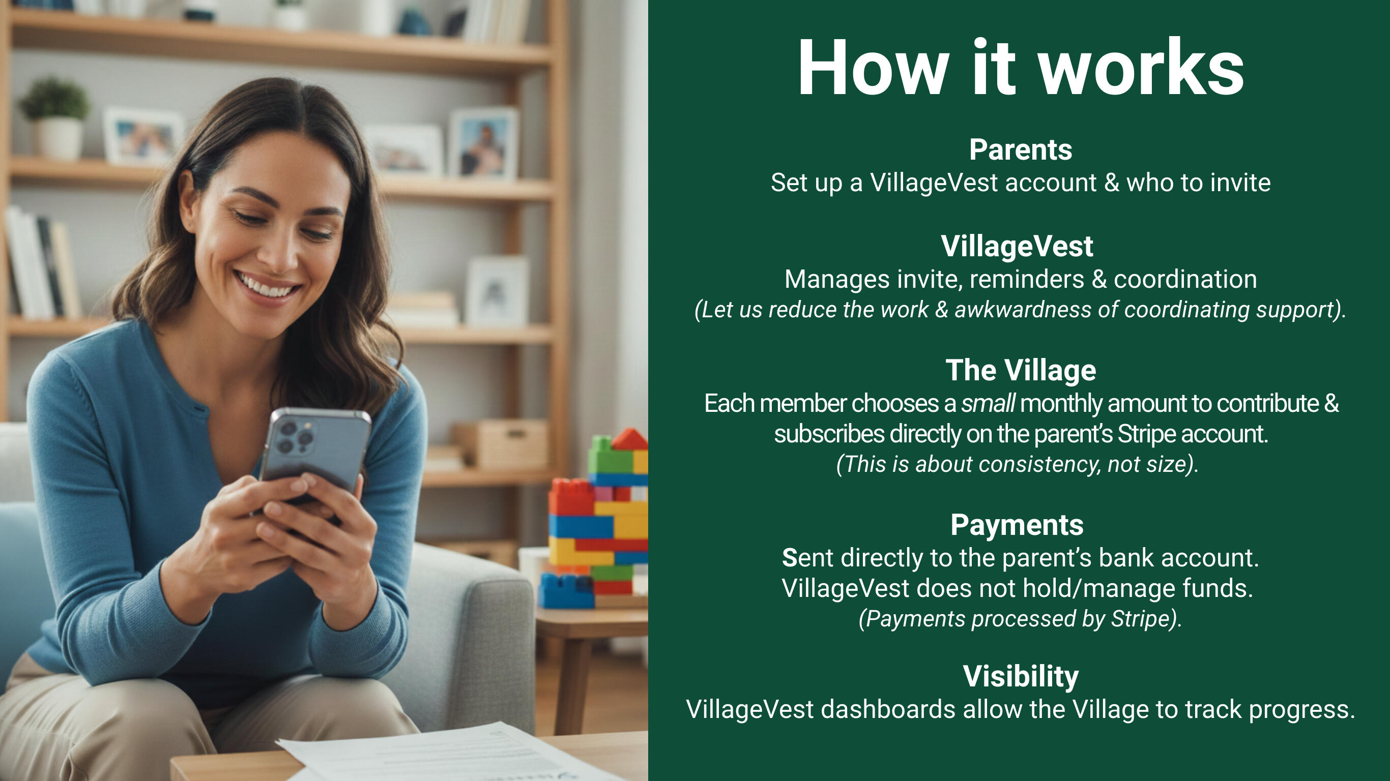 VillageVest provides software tools that enable individuals to coordinate recurring voluntary financial support from friends and family for the benefit of children. VillageVest is a coordination and transparency platform only.